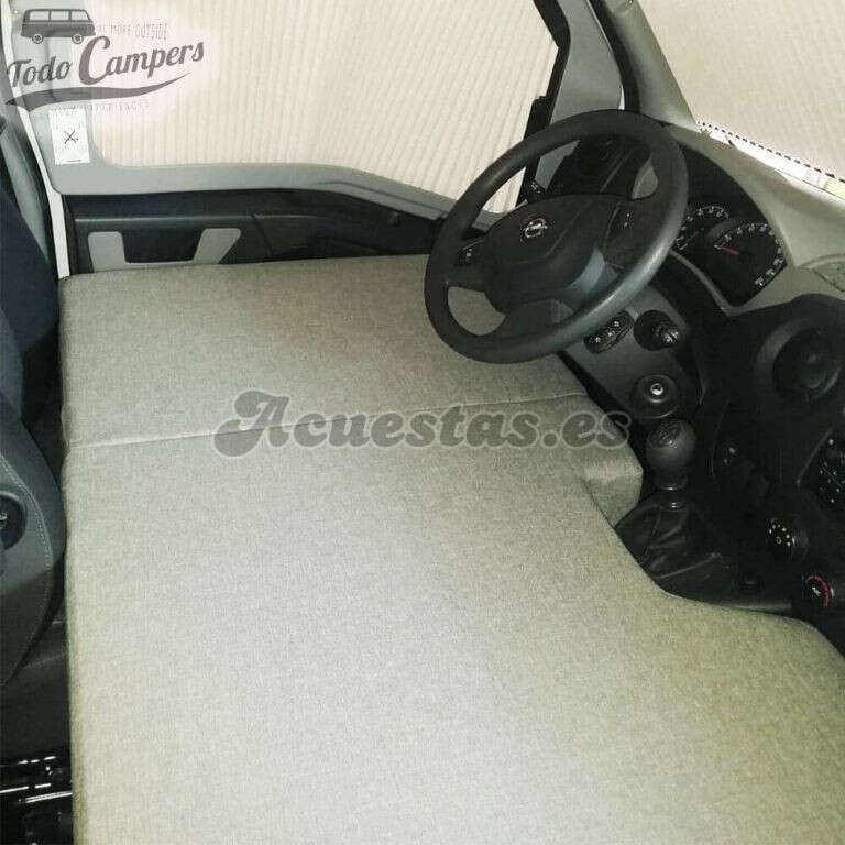 Cama plegable para niños. Se coloca desplegada en la primera fila de asientos. Compatible con dos asientos individuales y con individual más doble. Válida para la cabina de las furgonetas Renault Master, Opel Movano y Nissan NV400 desde 2011. Chasis X62.Tapicería de chenilla modelo Córdoba (varios colores a elegir).