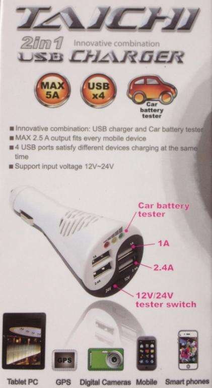 Conector toma mechero con cuatro salidas USB+test batería, apto tanto para 12 como para 24 vóltios , fusible de protección integrado y 5ah de capacidad maxima.